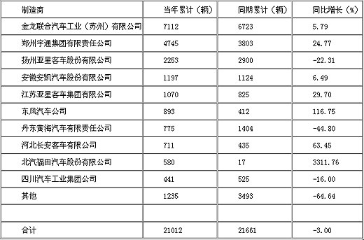 2005年1-12月份,前十名中型客车制造商中,金龙联合汽车工业(苏州)有限公司、郑州宇通集团有限责任公司、安徽安凯汽车股份有限公司、江苏亚星客车集团有限公司、东风汽车公司、河北长安客车有限公司和北汽福田汽车股份有限公司的产量同比均保持了增长的趋势,同比分别增长5.79%、24.77%、6.49%、29.70%、116.75%、63.45%和3311.76%;而扬州亚星客车股份有限公司、丹东黄海汽车有限责任公司和四川汽车工业集团公司则呈现下降的趋势,同比分别下降22.31%、44.80%和16.00%。