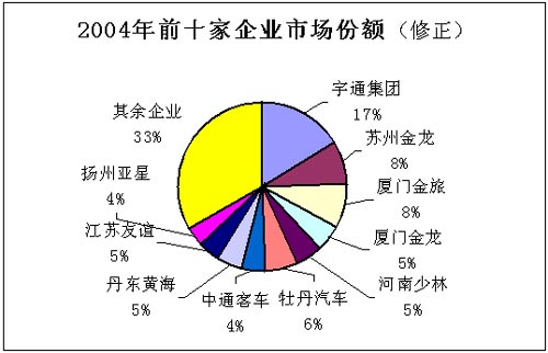 2005年客车行业前十位客车企业的市场集中度(5米以上客车)与2004年相比基本一致,保持在67%的水平,但前4位客车企业的市场集中却提高了5个百分点,由2004年38%提高到2005年的43%,市场份额(销量)分别为宇通19%(20314)、苏州金龙9%(10158)、厦门金旅8%(8814)、厦门金龙7%(7151);而5-10位企业的市场集中度却下降了5%,可见,前十位企业间的差距正在拉大,以三家金龙和宇通所形成的客车行业第一阵营企业的优势更加明显和突出。