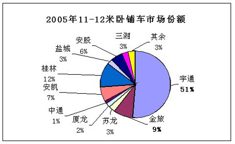 2005年11-12米卧铺车销量为3433辆,宇通客车在卧铺车市场占据了半壁江山,高达51%的市场份额,与其它企业相比占有绝对的优势。分置2至5位的企业为桂林大宇客车、厦门金旅客车、安凯客车和安凯股份客车,其市场份额分别为12%、9%、7%和6%。