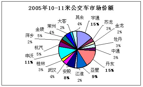 2005年11~12米客车销量为19066辆,占客车行业5米以上客车总销量(109811辆)的17.36%,其中,座位车、公交车和卧铺车所占份额分别为52%、30%和18%。