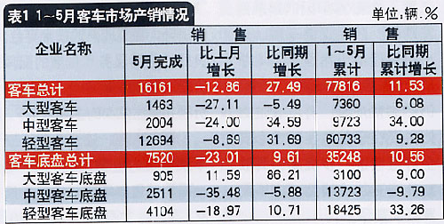 1~5月,客车总体产销呈现较快速度增长,其中中型客车增速较为明显,分别产销9384辆和9723辆,比去年同期累计增长了32.45%和34.00%。而中型客车底盘则是客车产品中唯一出现负增长品种,产销14435辆和13723辆,同比增长-5.13%和-9.79%,详见表1。说明中型客车改装车企业的产销量在下降,而整车生产企业加大了中型客车的生产。