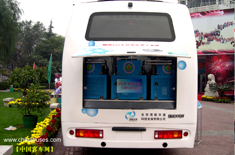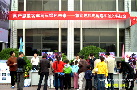 10月6日上午,由清华大学节能与新能源汽车工程中心与北京清能华通科技发展有限公司研制的国产氢能大巴开进了中国科技馆,向观众展示了其作为环保客车所具有的能源优势。