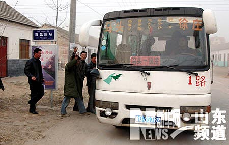 11月18日,山东省郯城县马头镇西爱国村农民在家门口坐上了去县城的客车。当日,沂蒙革命老区山东省郯城县668个行政村实现了村村通客车,147辆客车在24条城乡客运线路上往返行驶,为广大农民的出行提供了方便。