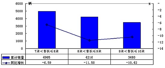 2005年1-8月不同车长中客整车累计销量及销量同比增长率