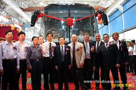 无锡市领导与澳方、美方客户在PK6137A高档客车前合影留念