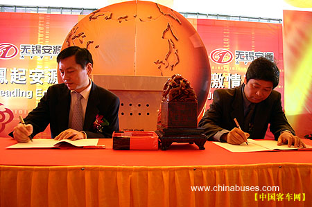无锡安源客车在致力于产品开发、营销服务、海外市场的同时,又着力在新能源客车领域创造新的发展,自从今年2月无锡安源汽车有限公司与澳大利亚BCI公司成功研制出国内首台新型混合动力车,使安源客车在环保、科技上又达到了一个新的高度。近来,安源客车又加强了对燃料电池大巴的开发力度,10月12日上午,安源客车与上海博信电池有限公司就燃料电池大巴合作项目进行了隆重的签约仪式。