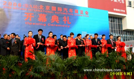 2006年第九届北京国际车展在世人瞩目之中于11月19日正式拉开帷幕。开幕式在一片祥和的氛围中召开。出席展会开幕式的主要领导有国家开发和改革发展委员会张国宝主任;全国政协常委中国机械工业联合会于征会长;中国机械工业集团公司王松林副总裁;中国国际贸易促进委员会张伟副会长;以及国家有关部委出席的领导,参展国家的驻华使节,和世界主要汽车厂商的代表。