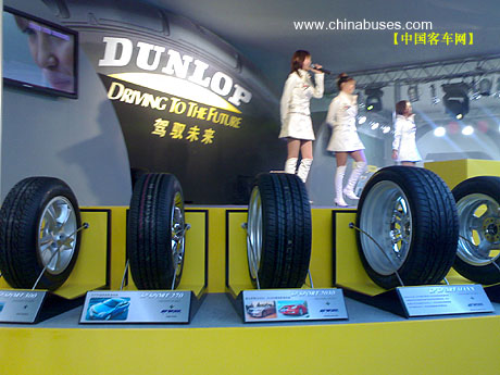 11月18日,邓禄普轮胎携其各款产品亮相2006第九届北京国际车展,在其位于国展的展区内,一一陈列的产品簇拥着一个精美的舞台,吸引了众多观众的眼球,这里正由前来助阵的日本数码女孩组合表演着精彩节目。