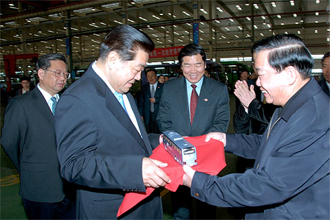 时隔14年故地重游,贾庆林主席踏足大金龙今年刚建成投产的现代化工厂时显得特别高兴,甫一下车即亲切地向在场员工挥手致意,并在大金龙董事长孙建华和总经理江世煌等人的陪同下径直走进总装车间视察。孙建华董事长向贾庆林主席汇报了大金龙2006年重要大事,他说:"大金龙于今年上半年正式完成整体搬迁,新工厂占地35万平方米,投资7.9亿元,设计年产能13000辆,已经成为国内乃至全球最大的大中型客车专业生产基地。大金龙今年还获得了'中国驰名商标'和'出口免验'资格,同时还被评为'国家汽车整车出口基地企业'"。贾庆林主席听到这些消息后,频频点头表示赞许,接过话题询问起大金龙的出口状况。当得知大金龙2006年外销数量接近1000台,产品大量远销到东南亚、中东、北非等市场,并且国内率先通过VCA产品认证成功进入意大利、英国、保加利亚等欧洲国家时,贾庆林主席感到十分满意,他鼓励说:"大金龙在自主品牌方面做得很成功,在国内已经具有很高的知名度,面向海外市场,更要注重自主创新,要在产品'品质和服务'上下功夫,全面提高产品国际竞争力,为行业和国家多做贡献"。