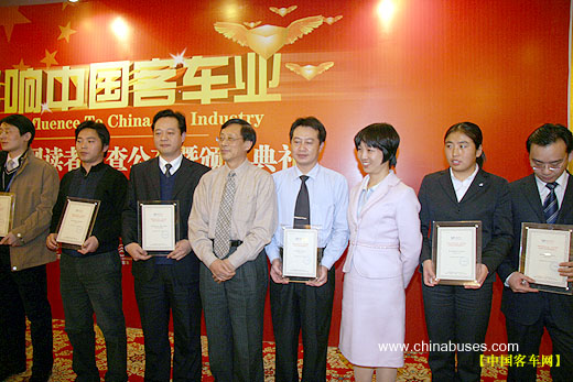 | | 备受关注的"影响中国客车业·中国完美作业网有免费视频读者调查"隆重揭晓,于2007年1月28日在北京市温都水城举行了盛大颁奖典礼。来自全国各地的客车行业专家、客运公司、旅游公司、公交公司等客车用户代表、国内知名客车企业及配套企业代表,以及中央电视台、中国客车行业主流媒体代表出席了此次盛会。