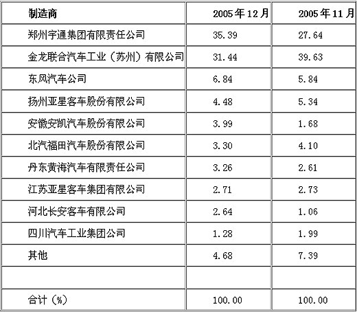 2005年1-12月份,前十名中型客车制造商的市场集中度达到93.79%。其中,前五名中型客车制造商,金龙联合汽车工业(苏州)有限公司、郑州宇通集团有限责任公司、扬州亚星客车股份有限公司、安徽安凯汽车股份有限公司和江苏亚星客车集团有限公司的市场集中度达到77.24%。