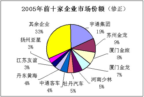 2005年客车行业前十位客车企业的市场集中度(5米以上客车)与2004年相比基本一致,保持在67%的水平,但前4位客车企业的市场集中却提高了5个百分点,由2004年38%提高到2005年的43%,市场份额(销量)分别为宇通19%(20314)、苏州金龙9%(10158)、厦门金旅8%(8814)、厦门金龙7%(7151);而5-10位企业的市场集中度却下降了5%,可见,前十位企业间的差距正在拉大,以三家金龙和宇通所形成的客车行业第一阵营企业的优势更加明显和突出。