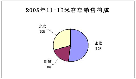 2005年11~12米客车销量为19066辆,占客车行业5米以上客车总销量(109811辆)的17.36%,其中,座位车、公交车和卧铺车所占份额分别为52%、30%和18%。