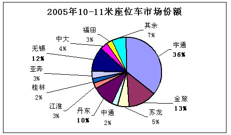 2005年10-11米座位车销售为5235辆,宇通客车占据了市场份额的1/3强,其次为厦门金旅客车、无锡太湖客车、丹东黄海客车和苏州金龙客车,市场销售份额分别为13%、12%、10%和5%。前5家企业的市场销售集中度高达76%。宇通客车的市场优势十分明显。