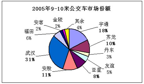 2005年销售9~10米座位车4600辆,其中:亚奔客车、苏州金龙客车、宇通客车、厦门金旅客车、安凯股份客车和厦门金龙客车分列1~6位,市场销售份额分别为19%、17%、12%、10%、7%和6%,市场集中度高达70%。在这一市场中,亚奔客车和苏州金龙客车处于市场领先地位,接近1/5的市场份额。
