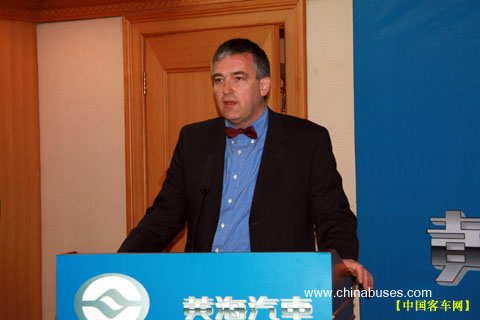 丹东黄海客车总经理郝庆军介绍黄海客车发展现状 在展区布置方面,黄海将设BRT展馆及迎奥运用车展区。两个展位同时做新车展示和推介。 在室内的BRT展馆内,黄海展出了和MAN在国外同步生产的12米及18米低地板BRT用车,这两款车均为黄海系列引进德国MAN技术的产品。现已形成批量生产能力,即将销往全国各地。