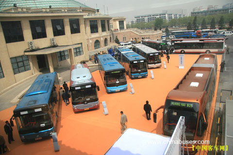 黄海客车迎奥运用车展区 在室外的迎奥运用车展区,黄海展示07年推出的新一代公交产品,共有6辆车,分别为12米柴油低地板客车、12米天然气低地板客车、13.7米城市客车、16米铰接客车、2辆18米铰接客车(一为方基调、一为流线形),这些产品将为北京、天津、沈阳、青岛等奥运城市进行车辆造型;为国内公交车辆向大型化、高档化、人性化发展的城市提供更多的选择。
