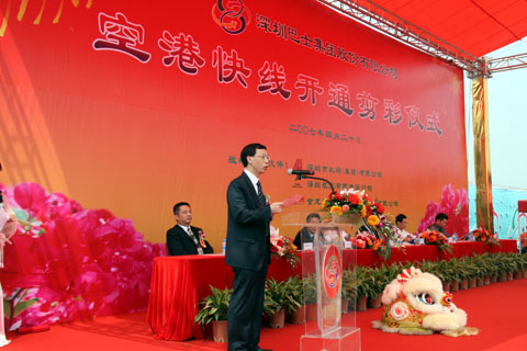 苏州金龙副总经理黄书平在深圳宝安国际机场空港快线开通仪式上讲话 据了解,此批投入运行的海格大巴为豪华座位车,在车型的选择上,充分考虑了道路特征和服务群体需求,配置了国Ⅲ排放标准的大功率发动机、ABS制动系统、电涡流缓速器安全系统,在车内配置豪华内饰和多种人性化设施,所有车辆上都安装了GPS智能调度系统和电子安防系统,为乘客提供安全、舒适的乘车条件。