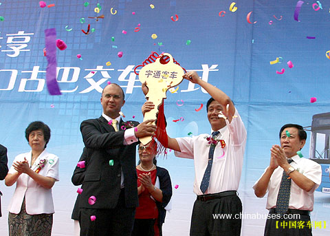宇通集团总裁汤玉祥向古巴驻华大使卡洛斯先生交付车钥匙