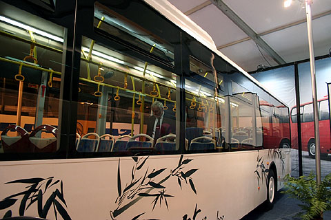 与此同时,大金龙前期为此次展会的准备也煞费苦心,其展场的布置更多渲染了一种纯正的中国元素和文化底蕴,这令大多对中国充满神秘感的欧洲人感觉,无疑具有更大的吸引力。在此次展会上,大金龙共推出了XMQ6127、XMQ6900、XMQ6121G等3辆展车,配合展场的布置分别饰予兰、竹、菊的喷图外观,在"君子"内涵的定义下,大金龙的展台布置虽显低调,但气势高昂;大金龙的超大背景强也是其展台布置的一大亮点,33×5