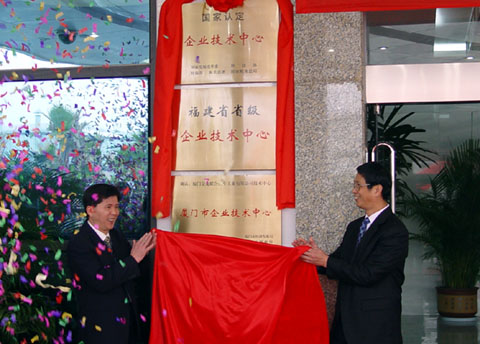 在掌声与礼炮声中,孙建华董事长与江世煌总经理庄严地为金龙汽车集团技术中心揭幕。