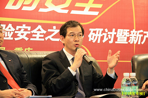 很高兴有机会在这里跟大家以人为本的大环境下讨论对我们乘客有意义的车辆的安全性的问题。其实在座的各位都是专家了,车的安全应该说它是有2个方面内容,一个是主动的安全性,一个是被动的安全性。从主动的安全性角度来讲,制造商都是从提高它的试验、提高它的自动性能,提高它的转向性能等这些方面来入手,采取一系列的技术措施来达到使汽车尽量的不发生交通事故,目前采用的比较多的技术,从上面安凯的这款车来看,有横向稳定杆、间隙自动调节,包括ASR和优化设计的一些技术,这些都是为了使汽车在行驶过程中,尽可能的不发生交通事故。