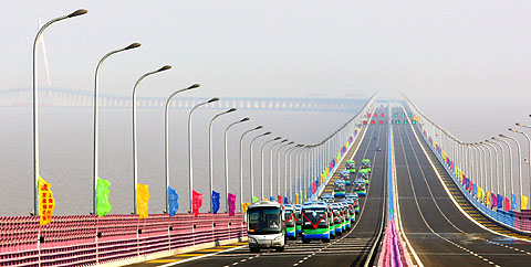 巨龙卧波架天桥,彩虹一飞凌云霄。5月1日下午3点40分,世界上最长的跨海大桥——杭州湾跨海大桥试运营通车。由苏州金龙海格客车组成的车队作为仪仗车队参加通车仪式,见证了这一长江三角洲一体化进程中的重要时刻。