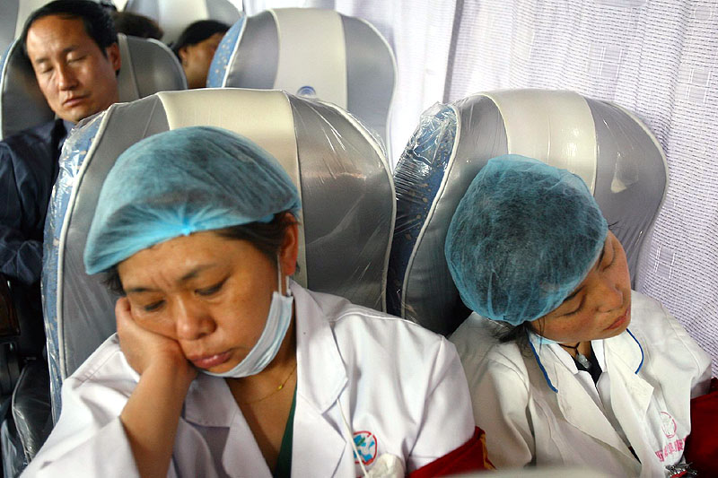 我们实在太累了。在灾区工作的几天内,虽然天天都会有余震,可是队员们太疲乏了,一回到宾馆倒头就睡着了。为了安全,疏散时都得清点人数,就是因为怕有睡着的同事没下来。
