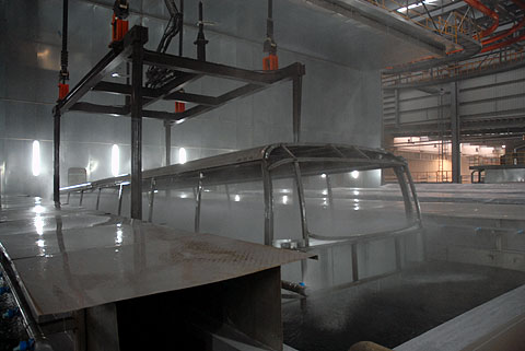 记者在生产线上看到,大型客车的整车车架和底盘已经是一体,通过自动传输线,先后放入9个不同液体的电泳池中进行处理。每个池子都可以将整车车身全部没过。整个生产线不像普通的涂装线有刺鼻的异味。