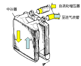 但是事物总有矛盾性,空气压力的提高就是空气密度的提高,空气密度的提高必然会使空气温度也同时增高,这如同给轮胎打气时泵会发热一样。发动机涡轮增压器的出风口温度也会随着压力增大而升高,温度提高反过来会限制空气密度的提高,要进一步提高空气密度就要降低增压空气的温度。据实验显示,在相同的空燃比条件下,增压空气温度每下降10摄氏度,柴油机功率能提高3%~5%,还能降低排放中的氮氧化合物NOx,改善发动机的低速性能。因此,也就产生了中间冷却技术。