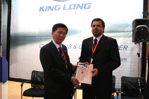 大金龙德国代理商总经理乔治展示杂志报道 近年来,金龙客车海外销售业绩持续快速增长,2006年实现外销1900台,销售收入1.2亿美元,销售范围从最早的东南亚、中东,扩大到了欧洲、南美和非洲。跨国经营方式也从单一的整车出口发展到整车出口、CKD出口两种模式。2007年,公司预计外销客车3500台,外销金额将超过2.4亿美元。
