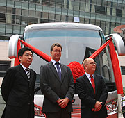 瑞典驻华公使严波,瑞典斯堪尼亚中国首席代表何墨池,苏州金龙总经理吴文文共同启动新品上市仪式