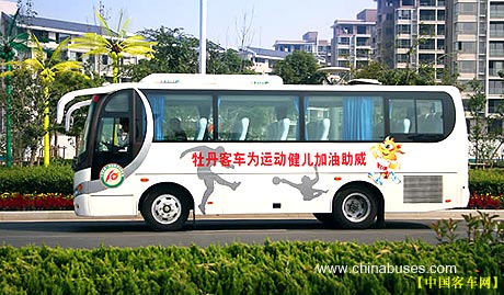 车型特点:基于牡丹“旭日”最初的多功能设计方案,该车采用流线型与方基调相结合,高大气派,优雅华贵,三段框架式大行李舱底盘配备半承载式的车身结构,品质卓越但不张扬。既适合中短途高速客运,又可作为城郊公交运输,同时还适用于企事业单位用车。前后围选用整体式镀锌板成型冲压件,并采用流线形设计,减小了车身自重和风阻。全金属材质车身使得车辆在行驶中的维修更为便捷。组合前大灯PC异型面罩内嵌式整体安装,气势不凡。侧围全封闭式大侧窗,隔音效果佳。特有银弧形侧围装饰带,溢满动感。后发动机舱采用四层隔热材料,装有特别吸音板,噪音远低于国家标准。