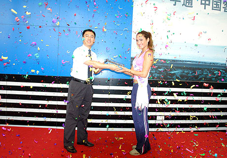 宇通公司副总经理王文兵将宇通车模送给古巴国际旅游小姐