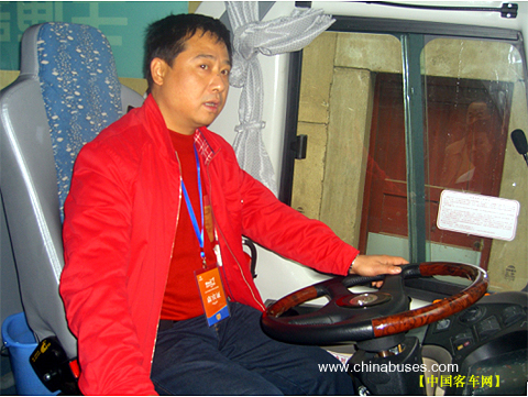 在客户参观车辆的时候,不时有人坐在驾驶位上体验宇通车的驾乘感受,互相交流着彼此的心得,一位身着红色茄克的客户坐在驾驶位上,对驾驶区进行了详细的观察,不时满意的点点头,一切尽在不言中!