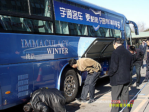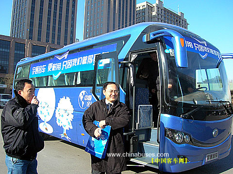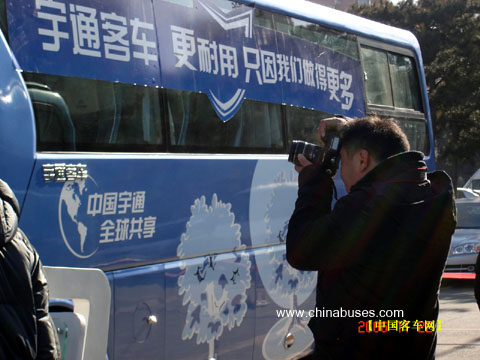 今天的沈阳已经是寒风袭人了,但是令我们意外的是在早上七点钟的时候,我们都刚起来,已经有客户在楼下看车了,我们的记者在匆忙之中拍下了这张沐浴着晨光的照片,记下了这感动的瞬间。因为会议9:30开始,当问到怎么来这么早时,看车的客户说:"听说宇通的新车运用了比较先进的技术,我们很关心,就迫不及待的来了。这车很漂亮,等会再听一下介绍,如果好的话,这车我们就要买下了。"