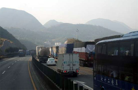 需要进入服务区加油的车辆在高速公路上无奈地等待着,与远处的大山构成了一道独特的风景,但是这种风景相信是所有人都不愿意看到的。