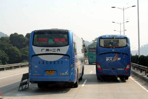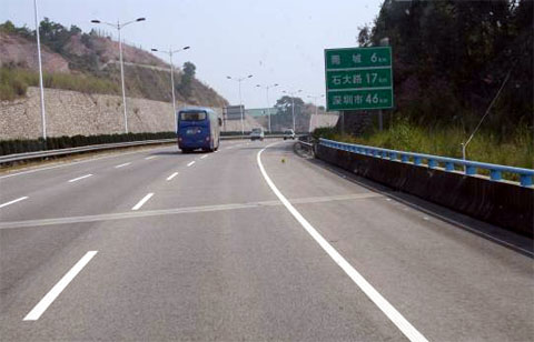 广深高速去往深圳方向的左车道正在修路,一路上车流量很大,急着赶路的我们车速也提不上去。正在前方超车的肖师傅从倒车镜里看到后面跟着的是一辆载有乘客的宇通客车,便把车从超车道驶入行车道,让他先过去。