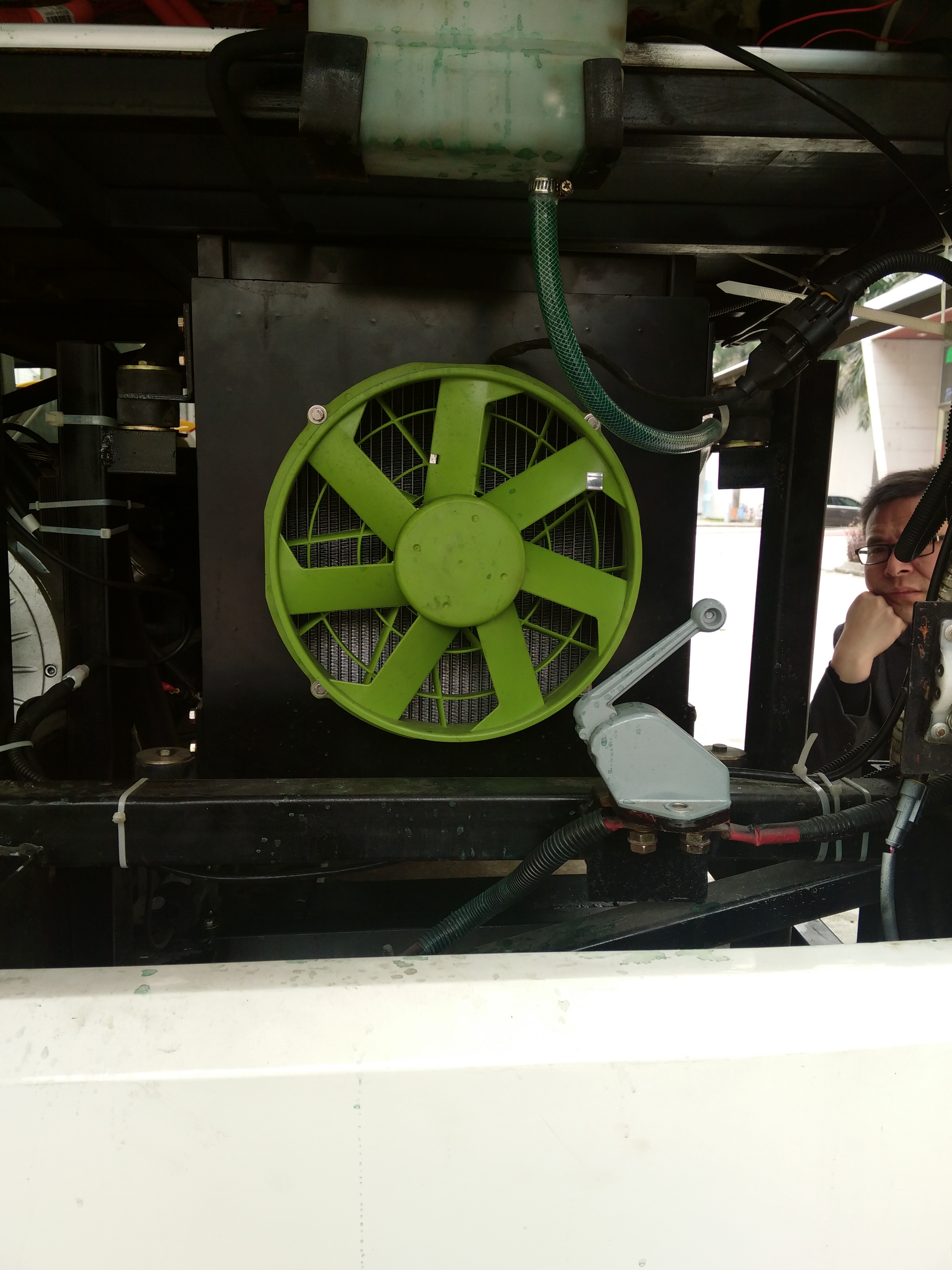 2、把有刷风扇改为无刷风扇,这项改进解决了风扇的工作寿命(工作寿命高达50000小时,五年以上),而且在同等风量下总的耗电功率比第四代下降了30%,使发动机更加节能,这款无刷风扇是自主研发的小功率无刷电机,风叶尺寸有150mm、285mm、305mm、385mm可供各种散热器厂家使用;专利号:ZL201320425317.0。