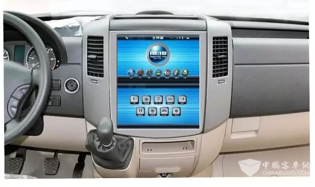 1;由上下两块屏幕组成,上屏实现娱乐视听、监控、导航、蓝牙通信、网页等功能;下屛实现控制灯光、空调、能量管理(包括电池、电机、SOC里程管理),并可拓展车队管理、驾驶与控制(动力模式/省电模式)等功能。