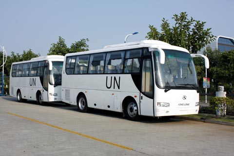 联合国维和部队(United Nations Peacekeeping Forces)是根据联合和国决议建立的一支跨国界军队,成立于1956年,目前主要活跃于国际上有冲突的地区。维和部队头戴蓝色钢盔,上印有联合国英文缩写“UN”二字,其专用设备、用品等也同样印有“UN”字样。本次大金龙厂区内停放的三台中巴就是为联合国维和部队打造的专用客车,将被用作加纳维和部队在达尔富地区执行任务时的交通车。