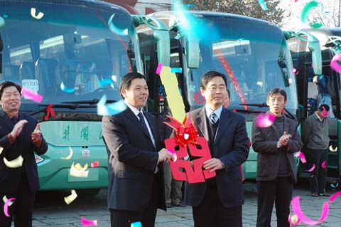 井冈山客人从中通客车董事长手中接过代表交付的金钥匙