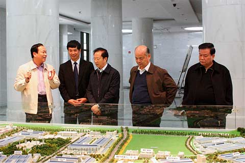 图为陈清泰观看汽车工业园规划模型