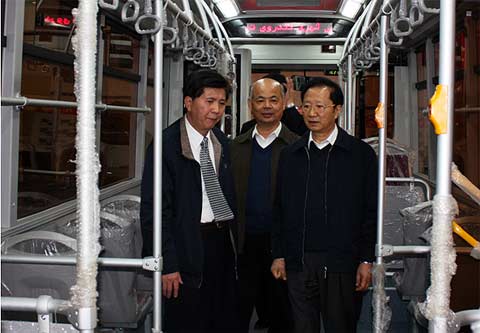图为陈清泰参观大金龙出口伊朗18米BRT公交车
