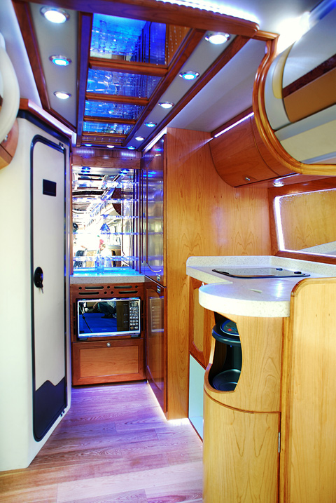 该车行李舱内安装3个手动滑轮式高尔夫球包架,为乘客提供巨大方便。行李舱的后尾顶部还安装了柴油发电机,除了可以供应厨房用电之外,还可以进行外接,方便乘客携带的手机等所需充电设备的使用。车子前方还安装了摄像头,并与室内电视连接,让乘客在欣赏两边风景的同时,还可以领略前方的精彩。车内采用航空行李架,并配以服务按钮,集安全便捷与一体。驾驶员操作区增加了鼓风系统,为驾驶员提供了冷气保障,保证车内温度的一致性。蝶式卫星天线的安装,让电视节目的接收不受地形、位置的限制,同时保证无线网络的有效利用。车内尽头是现代化的厨房及卫生间,咖啡机、饮水机、微波炉、冰箱及高档橱柜,为乘客的旅途及休息提供便利。