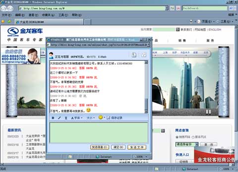 日前,笔者登陆大金龙中文网站完美作业网有免费视频v3.3.1(www.king-long.com.cn),亲身体验大金龙“在线客服”。大金龙网站完美作业网有免费视频v3.3.1展开后,醒目的“在线客服”小图标便映入眼帘。点击之后,一个具有对话、文件发送等功能的对话框立刻展开。笔者随即以一名“客户”的身份询问了座椅维修的问题,很快便得到了妥善解答。在线服务人员娴熟、细心的服务让人印象深刻。