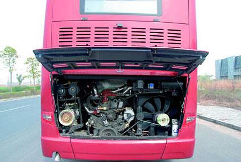 试驾车型搭载了功率为191kW的玉柴发动机,也许有人会对长13m,高4m左右的大车配备小功率发动机提出质疑,但是你要知道这可是一辆观光车。此外,亚星可根据客户的需求装配能满足国4排放标准的SCR选择性催化还原装置。用户只需定期添加尿素即可正常行驶。试驾车型的后置发动机怠速转速维持在500~600r/min,即便是坐在后排噪声也不是很响。该车配备了采埃孚6档自动变速器,档位之多也满足了车辆的各种行驶工况,尤其适用于大型车辆。例如,在城市中驾驶需频繁起步停车,又如驾驶员为配合导游的讲解可随时控制车速,运用自动档则免去了繁琐的换档操作。