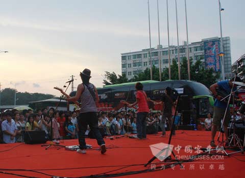 虽然深圳的气温较高,但在演出中,每一位到场的观众都激情自射,台上台下热烈互动,高大威猛的黄海音乐大巴也吸引了无数的眼球,纷纷有人上前合影,询问客车的产地、配置等,令人充分感受到了深圳人的热情,也为黄海的音乐之旅倍感自豪。