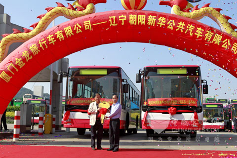 2010年10月27日上午,“厦门金龙旅行车有限公司—辽宁朝阳新华公共汽车有限公司”交接车仪式在金旅公司海沧大客生产基地门前隆重举行。辽宁朝阳新华公共汽车有限公司(以下简称“新华公交”)高占祥董事长、厦门金旅销售公司李鹏总经理等领导和嘉宾出席了此次交接车仪式。