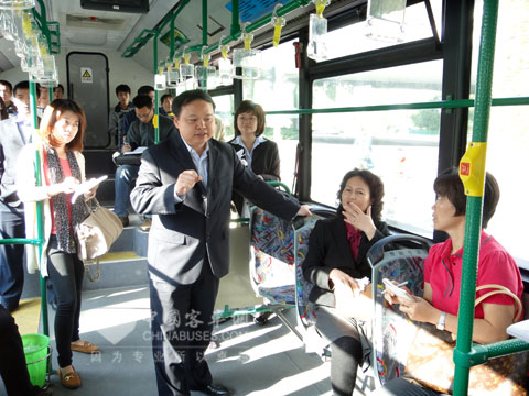 在当天的试乘过程中,厦门金旅总经理助理、技术中心主任赖志艺对于混合动力公交节能减排的特点向各位领导与媒体记者做了详细介绍。从赖总的言语中,我们感受到了金旅的责任心,也感受到金旅携手厦门市政府、市公交集团共筑“低碳交通”的信心。听着他的介绍,车上的各位领导也为这辆车的高性能、高配置所带来的环保和效益频频点头。